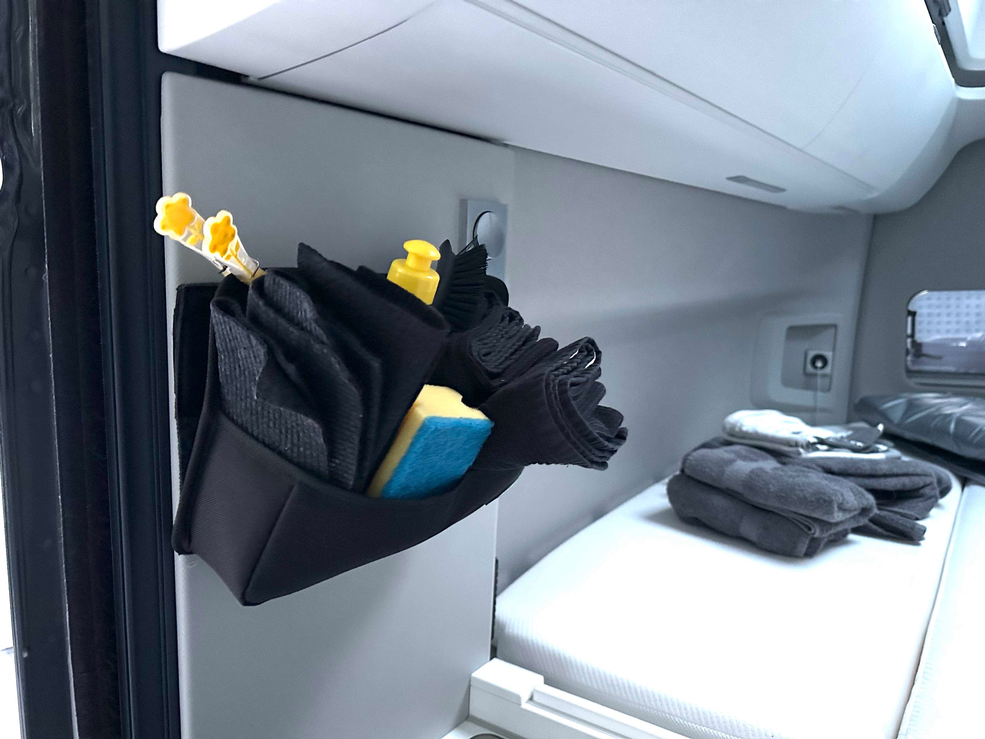 Organizertaschen und Bag XL im VW Grand California. Es wurden hier die StickIt-Lösungen (die einfache Klebelösung für Taschen von Felleisen) unter anderem im Feuchtraumbereich angebracht. Unser leichter Alu-Halter für das Bag XL wurden mit Schrauben befestigt.